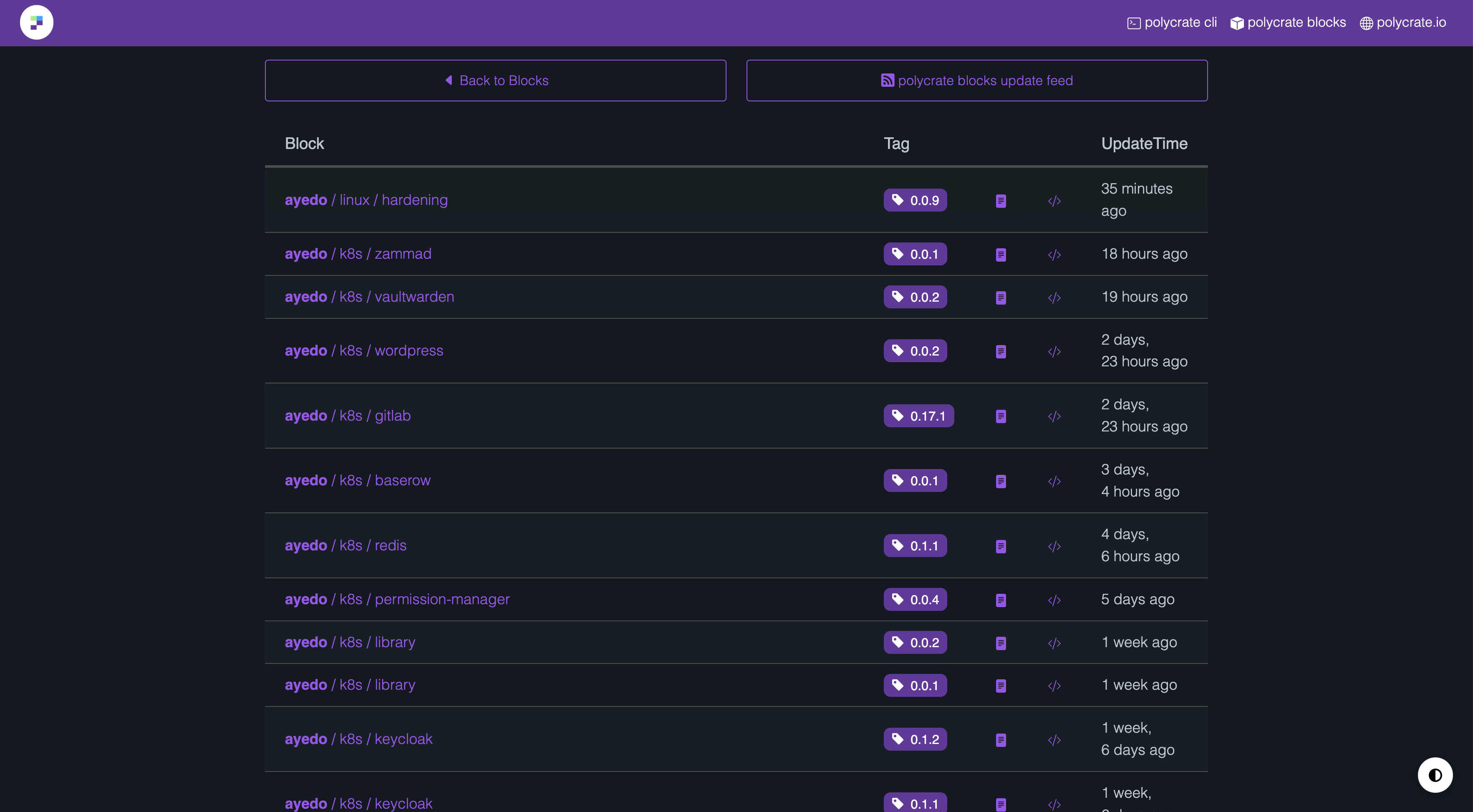 hub.polycrate.io ist die zentrale Registry für Blocks, die von ayedo entwickelt und bereitgestellt werden. Der PolyHub bietet eine kuratierte Sammlung von Production-Ready Blocks für häufige Infrastructure-as-Code Patterns.